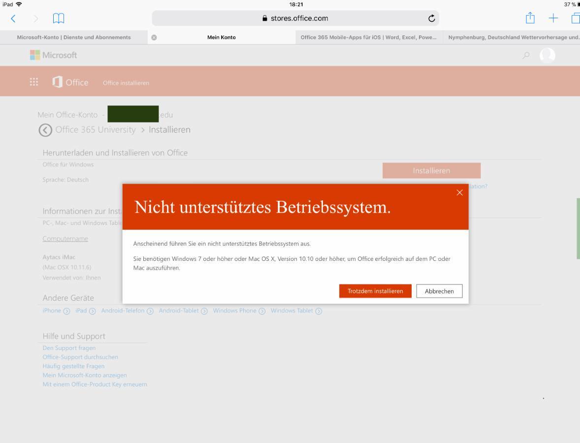 Ich habe noch 1 Lizenz frei, da ich auf dem alten iPad die installIonen gelöscht habe. Laut Microsoft ist das Problem nicht bei denen. Nun pendele ich zwischen Apple und Microsoft hin und her. Passwort und deinstallation und verschiedene internetzugänge habe ich ebenso ausprobiert. Irgendwelche weitere Ideen ?