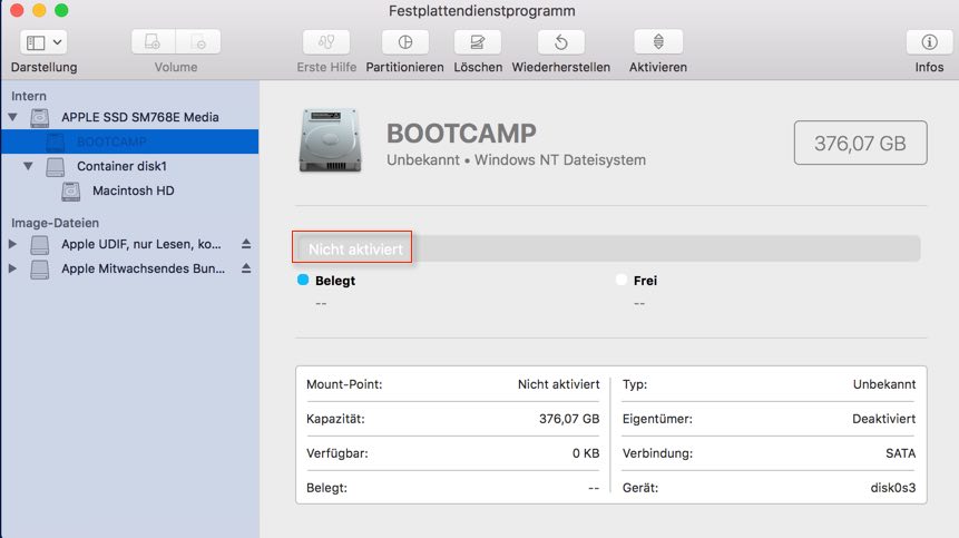 Bootcamp-Partition nicht aktiviert