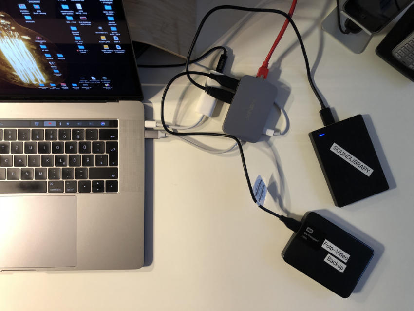 Ein Foto zeigt den aktuellen Zustand: Auf der linken Seite des MacBook sieht es übrigens fast genau so schlimm aus. Ein geeigneter Winkel-Adapter, bzw. ein entsprechendes längeres Winkelkabel würde die Unordnung verhindern, weil so alle Adapter und Festplatten nach hinten (fast) unsichtbar verlegt werden könnten.