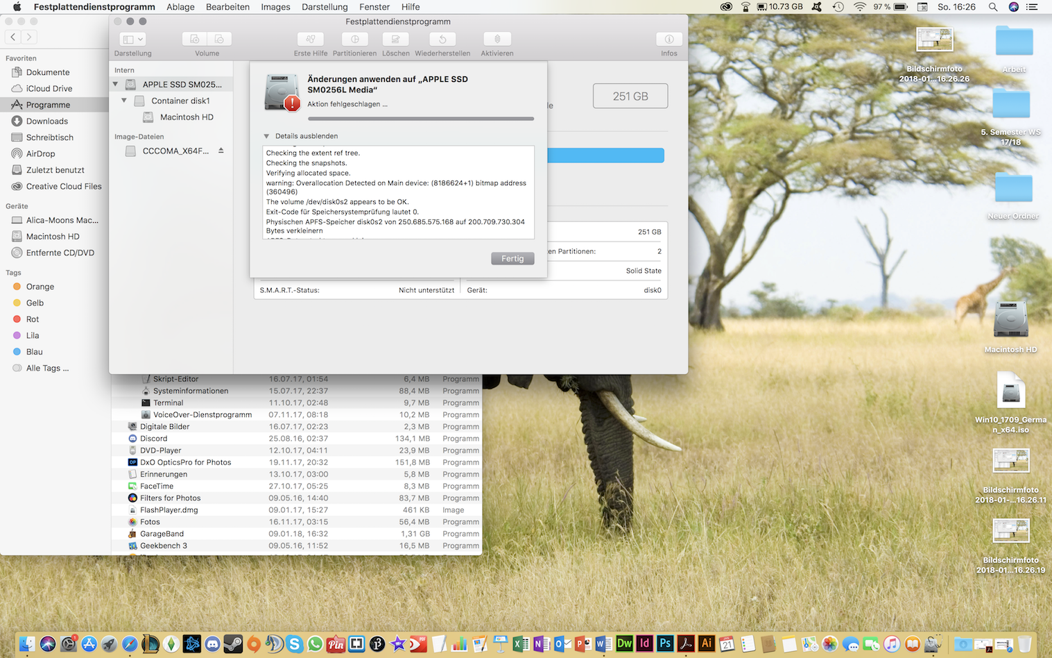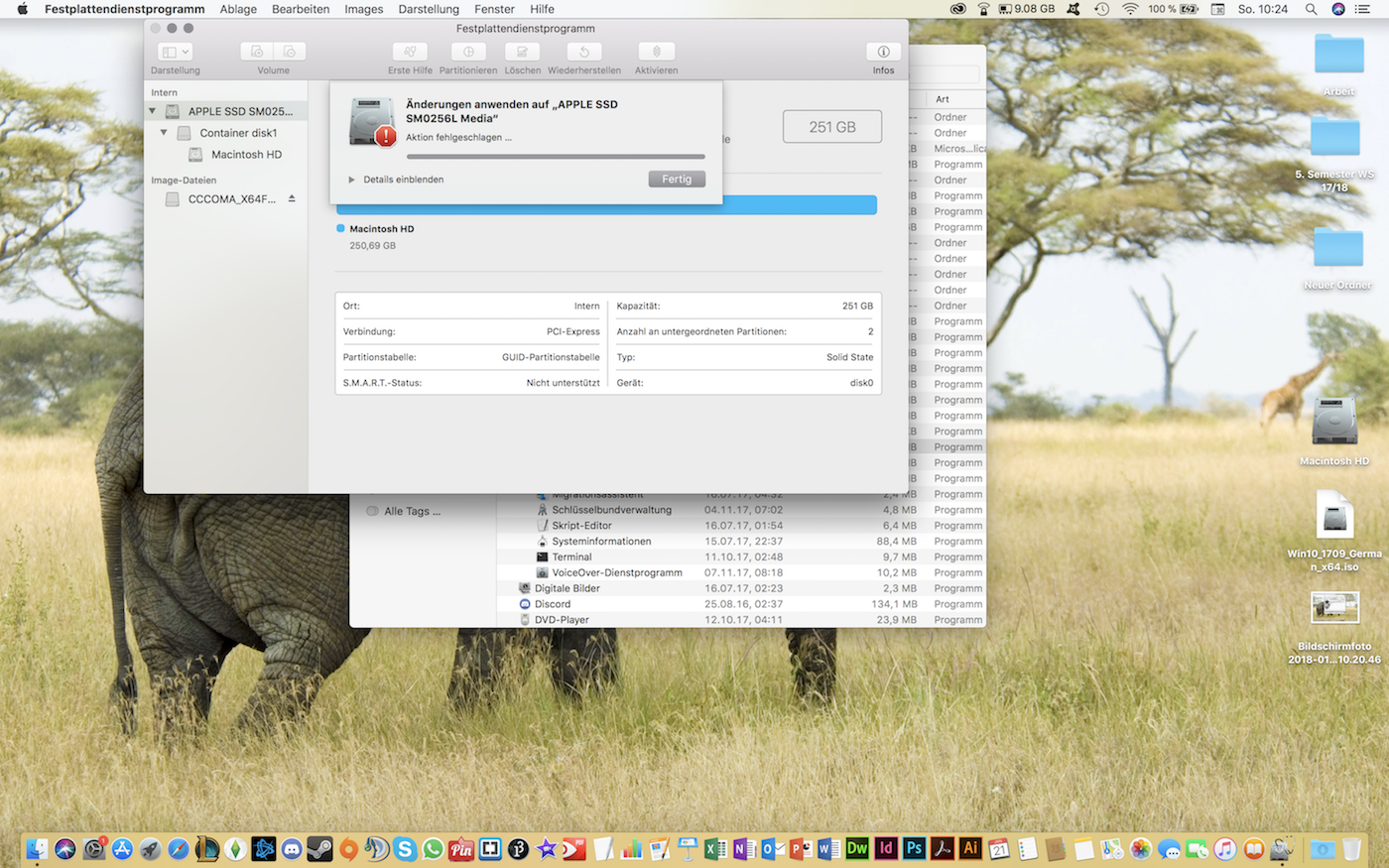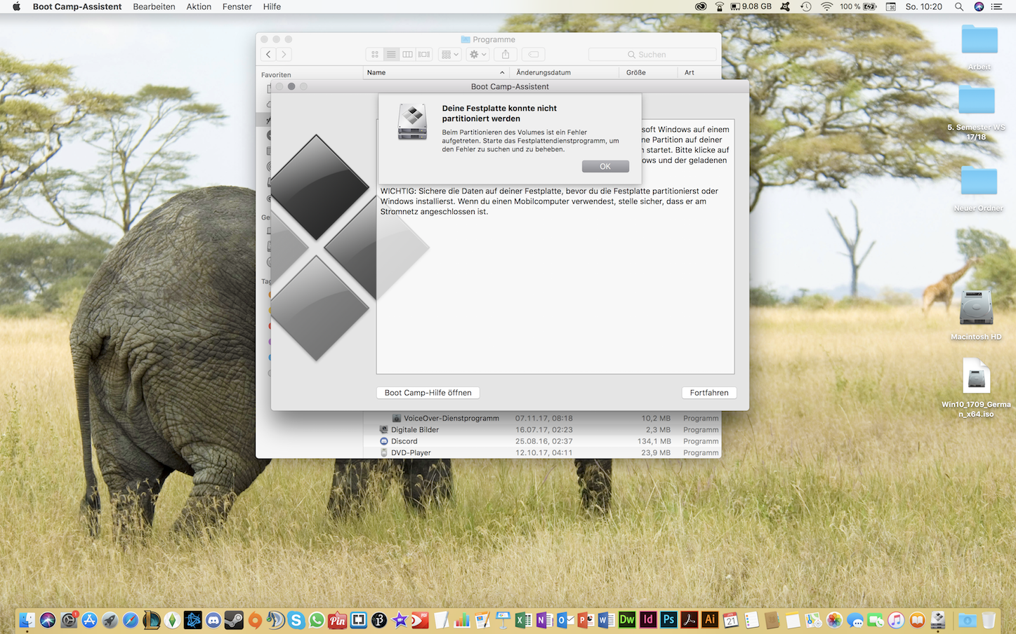 Dies dauerte eine weile 1-2 std. Danach versuchte ich eine Petition übers Festplatten Dienstprogramm. Auf einmal dat dies funktioniert ich war sprachlos. Aber leider war es nicht das was ich erreichen wollte. den ich wollte ja Windows installieren, und das geht nur über Boot Camp. Auch mit den angst im rücken das es evtl nicht mehr funktioniert, probierte ich sie zu löschen um eine Partition über Boot Camp erreichen zu können. Hier für brauchte ich weitere zwei anlaufe über Boot camp doch dann funktionierte es. Ich freute mich und hatte endlich 2 Festplatten aus einer gemacht eine mit High Sierra eine mit windows 10. Ich glaube ich habe 5 tage gebraucht doch dies wie ich glaube mit großem erfolg. Natürlich lässt windows einen verzweifeln aber für den Job brauch ich leider beides. man muss sich nur damit auseinander setzten können, viel Geduld an den tag legen und zeit. Vor allem weil einiges nicht mit windows kompatibel ist wie micro und Kopfhörer zum (headset) geht nur wenn man einen usb Adapter besorgt etc. Viel aufwand. High Sierra erschwert es einem schon.