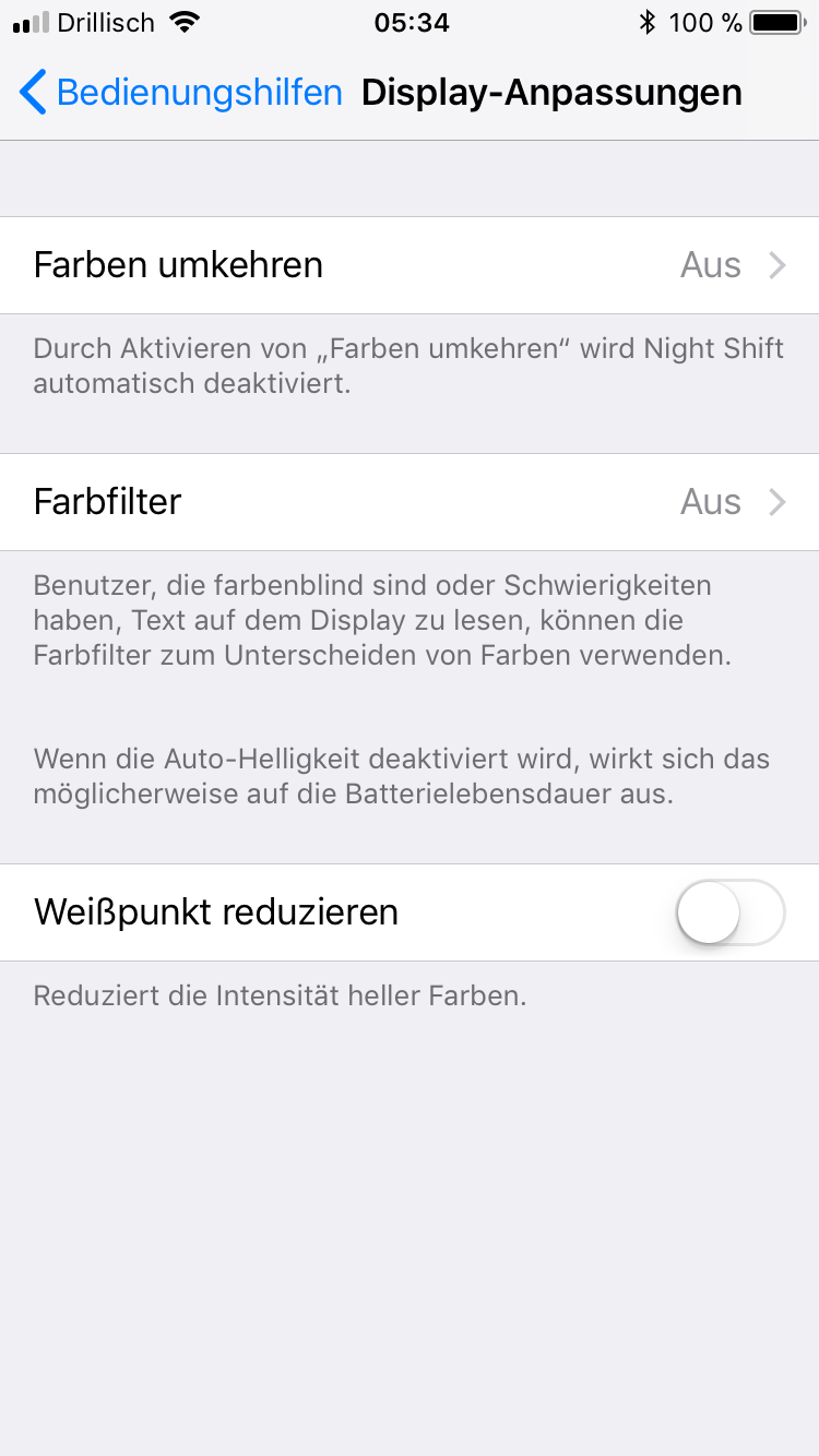 Hallo zusammen! Bei meinem iPhone 6 fehlt unter dem Punkt Displayanpassung der Punkt Auto Helligkeit. Es steht zwar was von wegen Auto-Helligkeit in Zusammenhang mit der Akkuleistung, jedoch kann ich hier nichts ein oder ausschalten. Gibt es dafür eine Lösung? Neustart wurde schon gemacht. Mit freundlichen Grüßen Robert