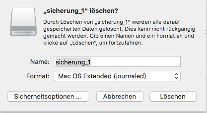 6. Nun kannst Du unter "Format" ein Format auswählen, dass Verschlüsselung unterstützt (z.B. Mac OS Extended (journaled, verschlüsselt))