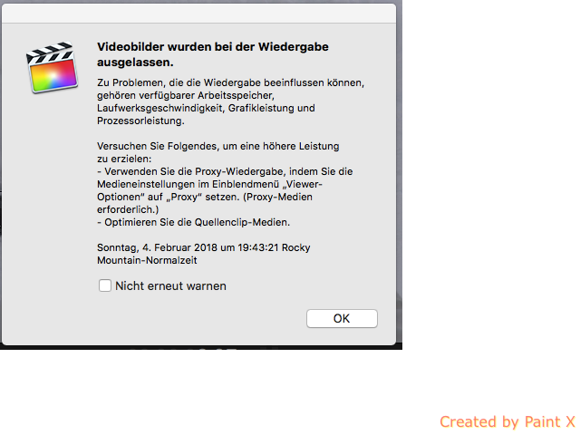 Sobald ich bei Final Cut einen neuen Clip einfüge und ihn schneide werden immer Bilder ausgelassen (Kommt sogar eine Meldung!) was ziemlich nervig ist und für mich das schneiden unmöglich macht! Habe schon alles mögliche versucht und nach Längerer such im Internet fest gestellt das das Programm im Hintergrund überhaupt nicht Rendert bzw. Es an manchen tagen ohne Probleme Funktioniert und an anderen eben nicht obwohl Rändern im Hintergrund aktiviert ist.