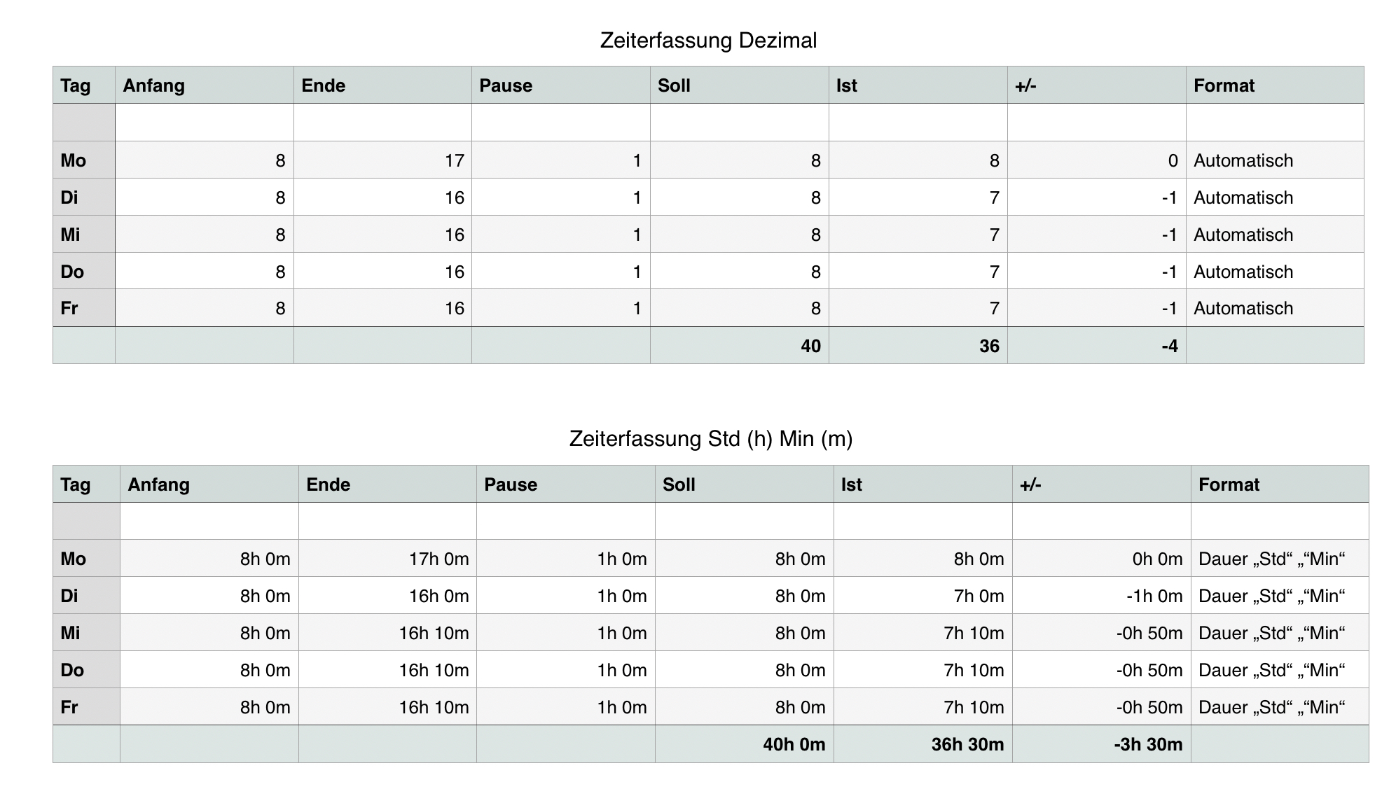 Numbers Zeitberechnung / Plus Minus stunden berechnen / Formel