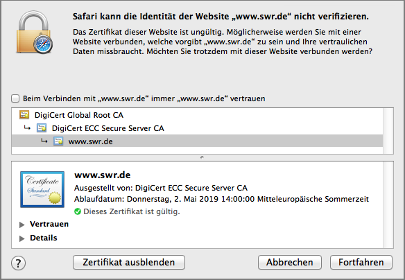 Problem: Safari kann die Identität der Website "xxx" nicht verifizieren.