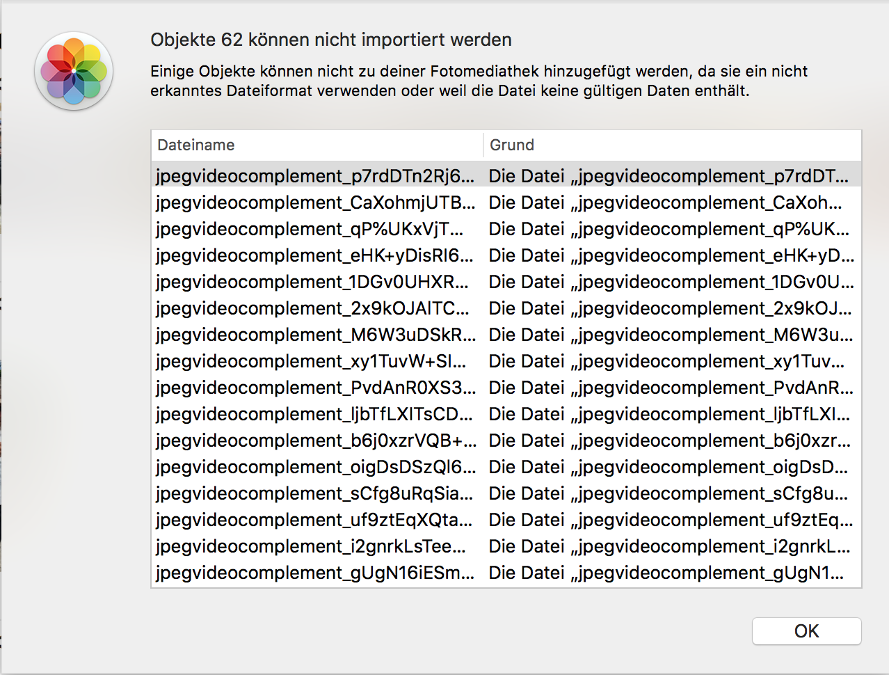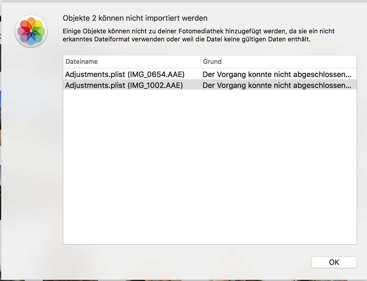 Die Dateien IMG_0665.AAE sind ja auch keine Videos oder Bilddateien, sondern sidecar Dateien, in den Anpassungen beschrieben werden. Sie können nur indirekt importiert werden, indem man ein Bild IMG_0665.JPG importiert. Dann wird Fotos auch die zugehörige sidecar IMG_0665.AAE lesen und die Anpassungen vornehmen. Es ist interessant, dass in der neuen Mediathek nur noch zwei Dateien mit Anpassungen Ärger machen.
