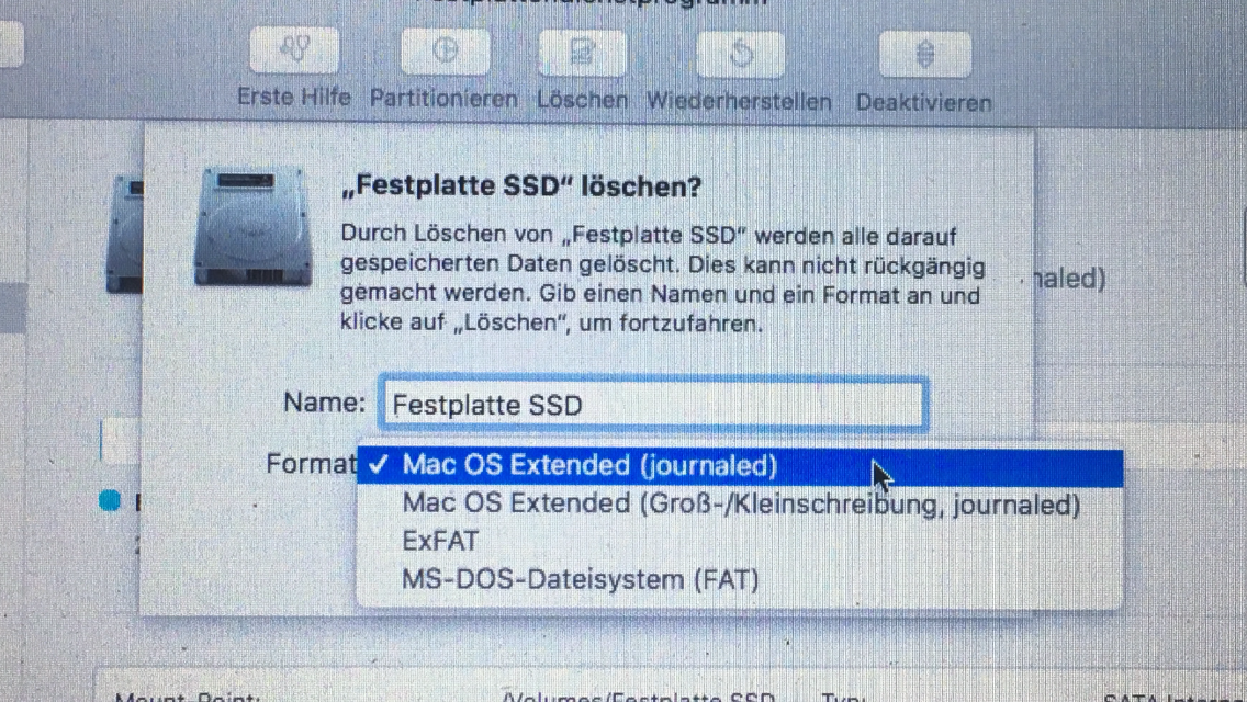 Nun habe ich versucht, sie im Festplattendienstprogramm zu formatieren (Mac OS extended), das nützt aber nichts. Die Schaltfläche „Partitionieren“ ist grau und lässt sich nicht klicken. (Bild 3)