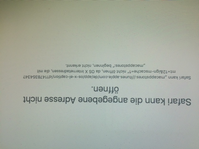 Wenn ich aber direkt den Link anklicke (über online Hilfe aufrufen kann ich Safari starten), wird aus https:// sofort ‘macappstore:’. Und dann kommt die Meldung:Safari kann die Adresse beginnend mit ‘macappstores’ nicht erkennen. ( die Festplatte ist bereits gelöscht. Da befinden sich keine Apps)