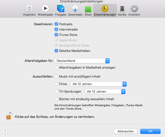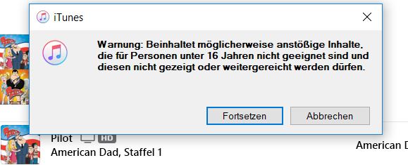 Seit dem neusten Itunes (12.7.4.76) bekomme ich jedesmal die Meldung "Warnung, beinhaltet möglicherweise anstössige Inhalte [...]" wenn ich einen Film oder eine TV-Sendung abspiele, die eine Altersfreigabe hat. Ich habe z.B. eine Playlist einer Serie, muss jetzt aber jedesmal vor jeder Folge die Warnung wegklicken. Wie kann ich dies abstellen?