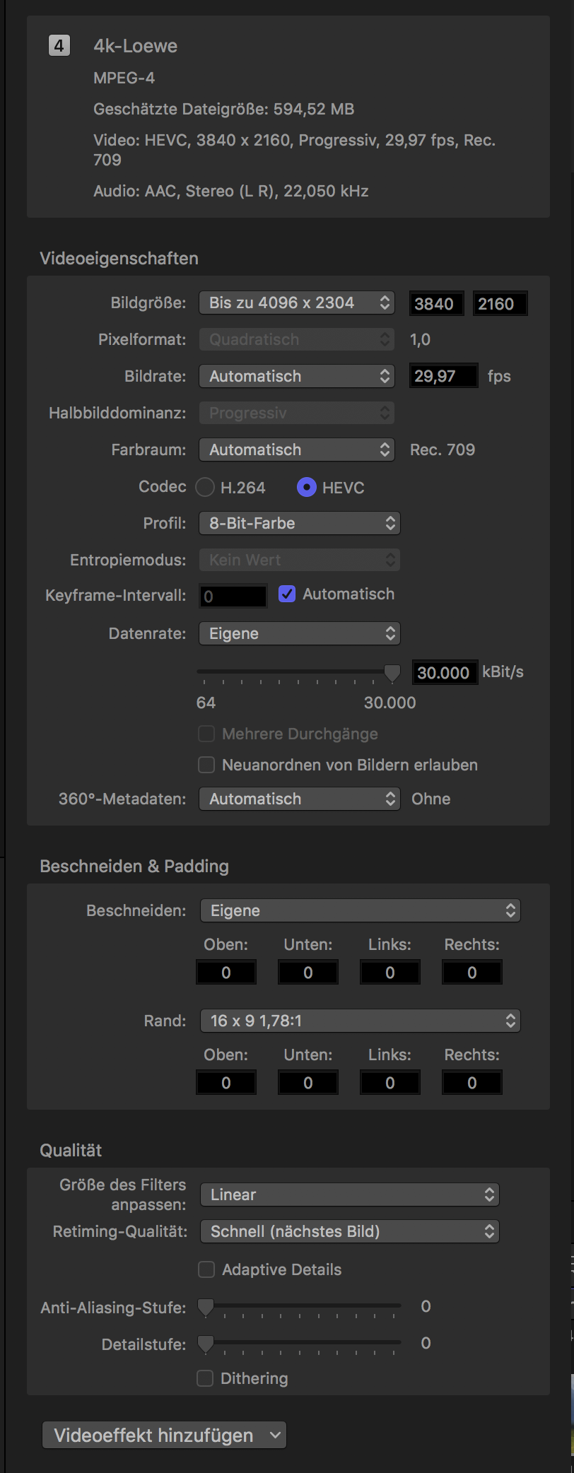 Das fertige Video wurde im Compressor in 2min45sek berechnet, also fast Echtzeit, und hat eine Größe von 550MB (etwas weniger als die geschätzte Dateigröße)