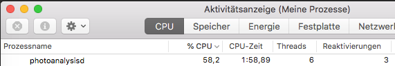 Der photosanalysisd ist die künstliche Intelligenz von Fotos. Er läuft im Hintergrund, um die Fotos in der Mediathek zu analysieren und in Kategorien zu klassifizieren. Er erkennt die Objekte in den Bildern, sucht nach Gesichtern und versucht Personen zu identifizieren. Es werden auch typische Szenen erkannt, Geburtstagtorte oder Weihnachtsdekoration, Sonnenuntergang, usw. Der Prozess läuft immer, wenn neue Fotos importiert wurden und wenn Fotos gerade nicht benutzt wird. Die Bildnanlyse benötigt sehr viel Rechenleistung.