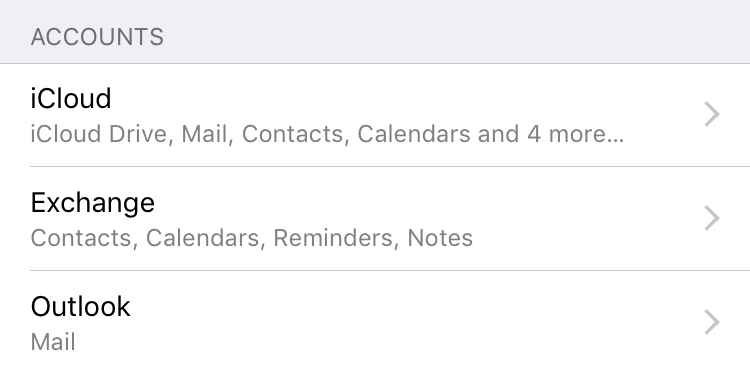 Im Beispielbild siehst Du, ich habe das eben extra mal kurz umgestellt, „iCloud“ macht ganz vieles, „Exchange“ nur "Kontakte", "Kalender", "Erinnerungen" und "Notizen" und „Outlook“ macht nur "Mails".