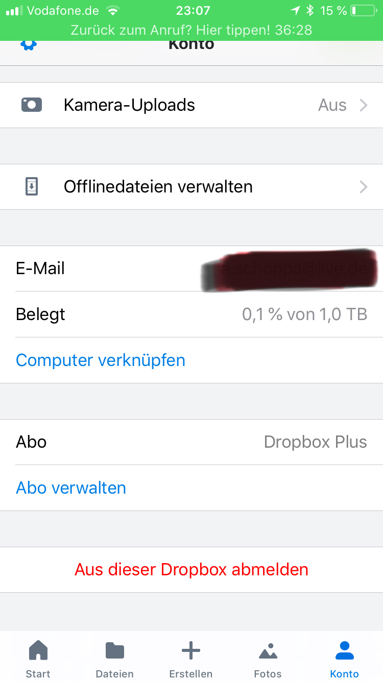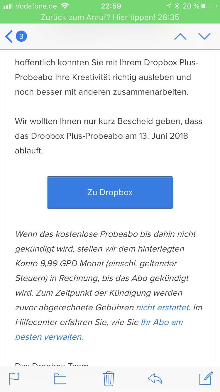 Ich habe ein ProbeAbo von Dropbox, welches Übermorgen kostenpflichtig sein wird. Ich kann dieses Abo weder im Internet kündigen, unter www.dropbox.com noch unter meinen Abos im Iphone.