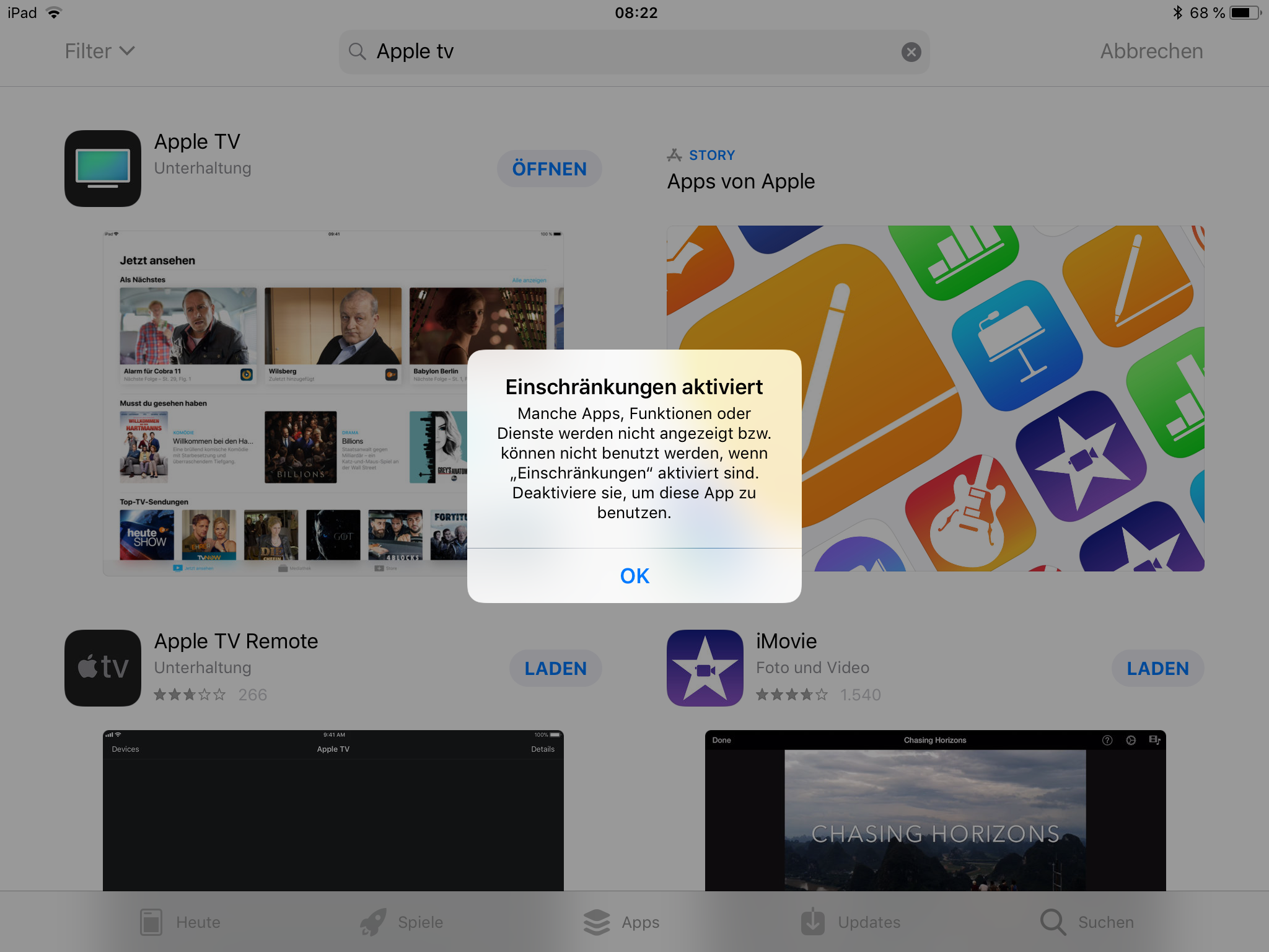 "Einschränkungen" verhindert das öffnen der Apple TV App