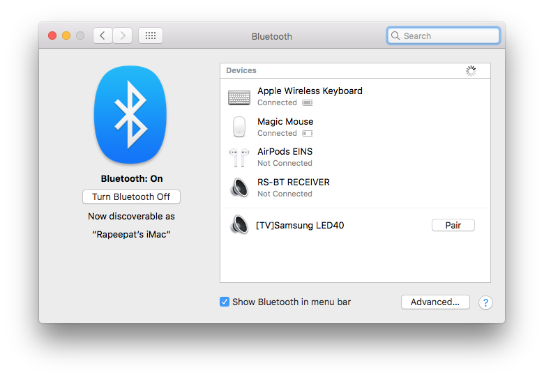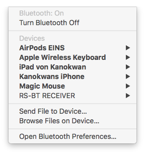 ich habe das Problem mit der Bluetooth Verbindung schon eine Weile und kann leider nicht mehr ertragen. Das Bluetooth von meinem iMac 27" Late 2013 mit OS 10.12.6 (aktuellste) verbindet sich einfach selber mit den anderen Geräten in Familien - sowie das iPad/iPhone von meiner Frau oder manchmal auch mit meinem eigenem iPhone -, also noch nie mit den Geräten von anderen. Das Problem taucht sich meisten auf, wenn ich die AirPods mit dem iMac verbinde. Irgendwann wird das Bluetooth Signal gestört. Das Maus bewegt sich nicht richtig und die Tonwiedergabe auf AirPods bricht ab. Ich kann für ca. 30 - 60 Sek. abwarten und die Verbindung mit unerwünschten Geräten wird automatisch abgebrochen. Danach funktioniert das maus wieder aber die AirPods mal so mal so. öfter muss ich die AirPods disconnecten und nochmal Manuel verbinden.