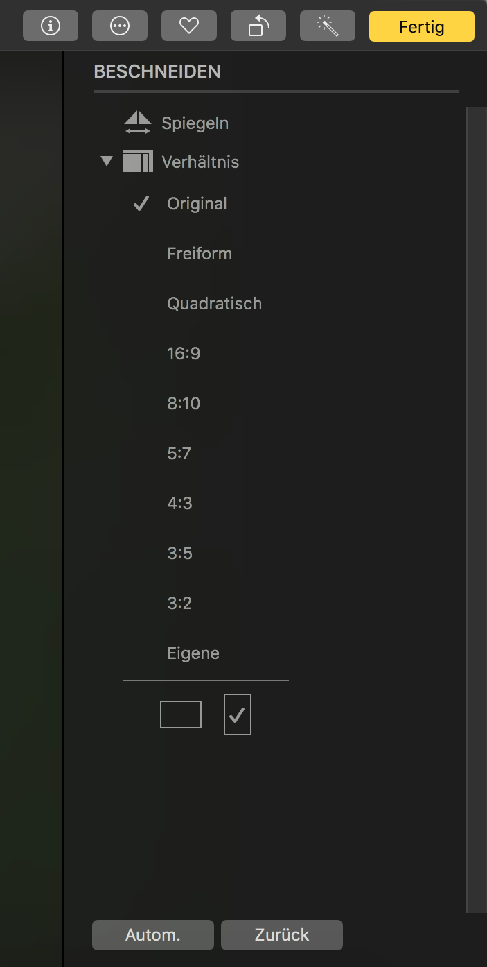 dann stimmt etwas nicht, mit den Formaten. Ändere die Bildformate mal in Hoch- oder Querformat: Einfach in Fotos "Bearbeiten" > "Bescheiden" und dann wie auf dem Bild (für Hochformat oder eben Querformat) einstellen: