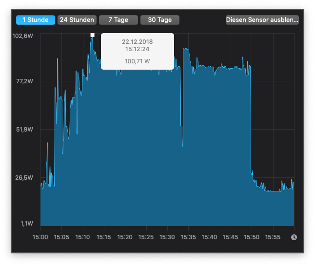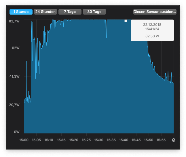 Ich habe gerade eine erschreckende Feststellung gemacht. Das Netzteil meines neuen 2018 15" MacBook Pro ist nicht in der Lage, den Laptop unter Volllast mit ausreichend Strom zu versorgen. Drückt sich dann dadurch aus, dass die Batterie währenddessen entleert wird. Festgestellt habe ich es unter BootCamp bei ca. 10% CPU Auslastung und 100% Auslastung der Radeon Pro 560X. Nach ca. einer Stunde war meine Batterie auf 57% runter. Unter macOS wird die Hardware scheinbar so gedrosselt, dass das MacBook die 87W des Netzteils nicht überschreitet, trotzdem scheint ja dort leistungsmäßig Luft nach oben zu sein, wenn mehr Strom zu Verfügung stände. Dass die Kühlung das schafft, beweist die Last unter Windows.