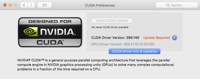 Für Filmbearbeitung und 3D nutze ich CUDA und seit einiger Zeit streiken die Programme, die darauf zugreifen, weil mir das Berteibssystem die folgende Fehlermeldung ausgibt. Mal kann ich dann ein Update installieren, was aber nicht hilft, da genau die gleiche Fehlermeldung wieder kommt. Ich habe auch das gesamte Paket schon entfernt und neu installiert, was auch nicht half. Ist die CUDA Zeit für den Rechner einfach abgelaufen, weil nVidia und Apple getrennte Wege gehen, oder was kann ich hier noch tun um das zu beheben?