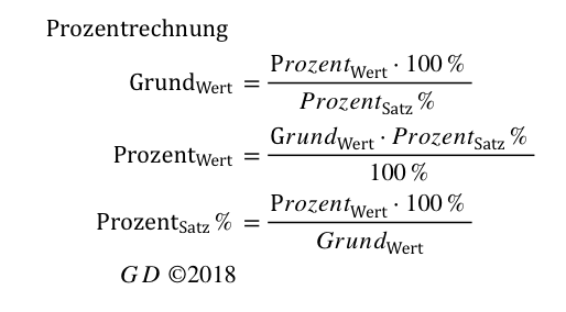 \text {Grund}_\text{Wert} \thinspace &= \frac { \text Prozent_\text{Wert} \cdot 100 \% } { Prozent_\text{Satz} \% } \\