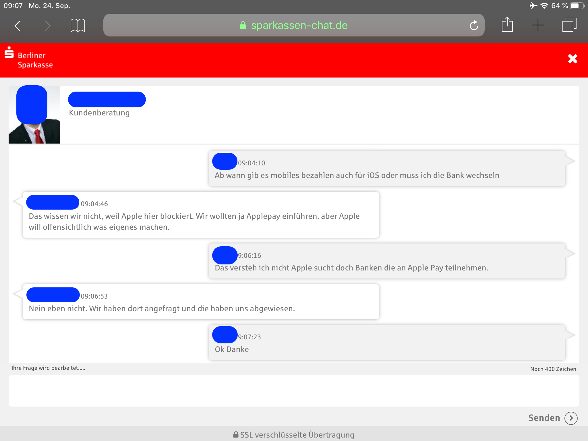 Der Berater schreibt aber, dass die Sparkassen Apple Pay einführen wollten und Apple sich quer stellte.