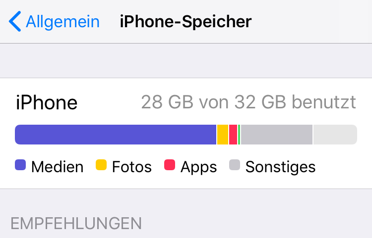 ich habe ein kleines (großes) Problem mit der Verwaltung meines iPhone-Speichers. Mehr als die Hälfte des Speichers wird aktuell von sogenannten Medien eingenommen und ich habe keine Ahnung, was diese sein sollen. Ich habe nur wenige Apps, die jeweils nicht mehr als 200 MB verbrauchen. Fotos, Videos und Musik habe ich auch wenig, das dürfte also nicht das Problem sein. Ich habe auch keinen HD-Film geladen. Da ich jetzt nur noch ein paar wenige GB zur Verfügung habe, würde ich echt gerne wissen, was diese Medien sind und wie ich sie ggf. löschen kann. Vielleicht kennt sich ja jemand aus.
