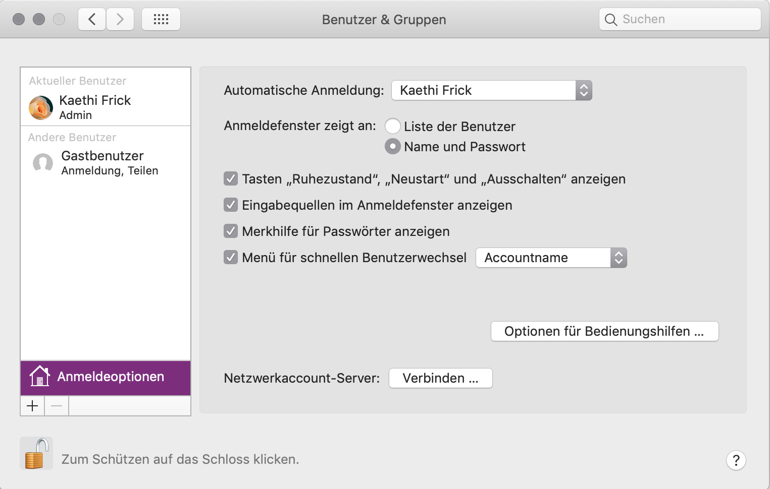 Nach den Ferien löschte ich meinen Account wieder, ebenfalls die dazugehörigen User-Ordner und -Dateien. Nun war aber nach Neustart oder Ruhezustand für den Admin stets eine Anmeldung mit Passwort notwendig, obwohl ich automatische Anmeldung aktivierte (siehe Screenshot). Ich machte erfolglos einen NVRAM-Reset (Alt-Command-P-R), dann einen SMC System Management Controller Reset. Immerhin war nun die Anmeldung wenigstens "automatisch"nach Neustart, nicht aber nach einem Ruhezustand.