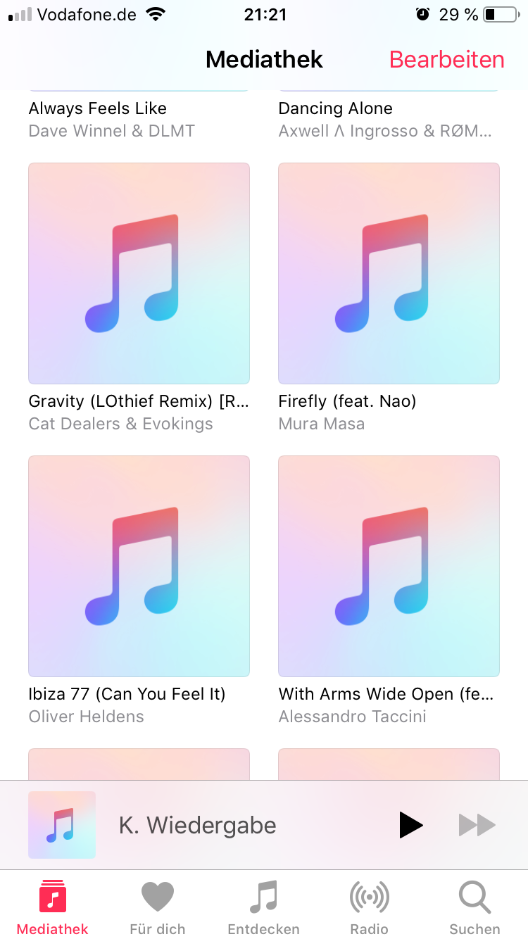 ich kann in der Musik App seit kurzem keine Musik mehr laden. Der Kreis dreht sich zwar, es kommt dann auch soweit, dass es eigentlich geladen werden soll, aber beim Laden erfolgt kein Fortschritt, sodass es danach bald wieder zurück zum Cloud-Symbol zurückspringt (Also das Symbol mit der Wolke und dem Pfeil nach unten).