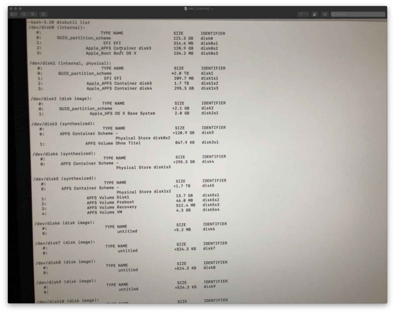 3. Der Apple Mitarbeiter hat dann via dem Terminal versucht, die einzelnen Partitionen zu verknüpfen, leider ohne erfolg, nun habe ich noch mehr Partitionen... (Siehe Bilder)