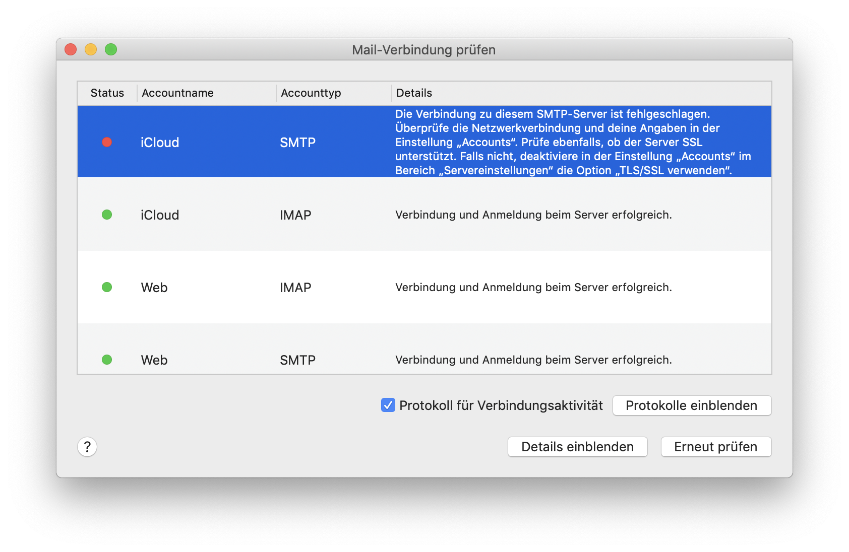 Ich kann dort Mails empfangen, aber das Versenden der Mails macht immer wieder Probleme. Der SMPT-Server meines iCloud-Accounts scheint nicht erreichbar zu sein. Wenn ich das Fenster "Mail-Verbindung prüfen" aufrufe, kann man sehen, dass sich der iCloud SMPT ewig nicht verbindet und letztendlich eine Fehlermeldung auswirft, dass der SMPT-Server nicht erreichbar ist.