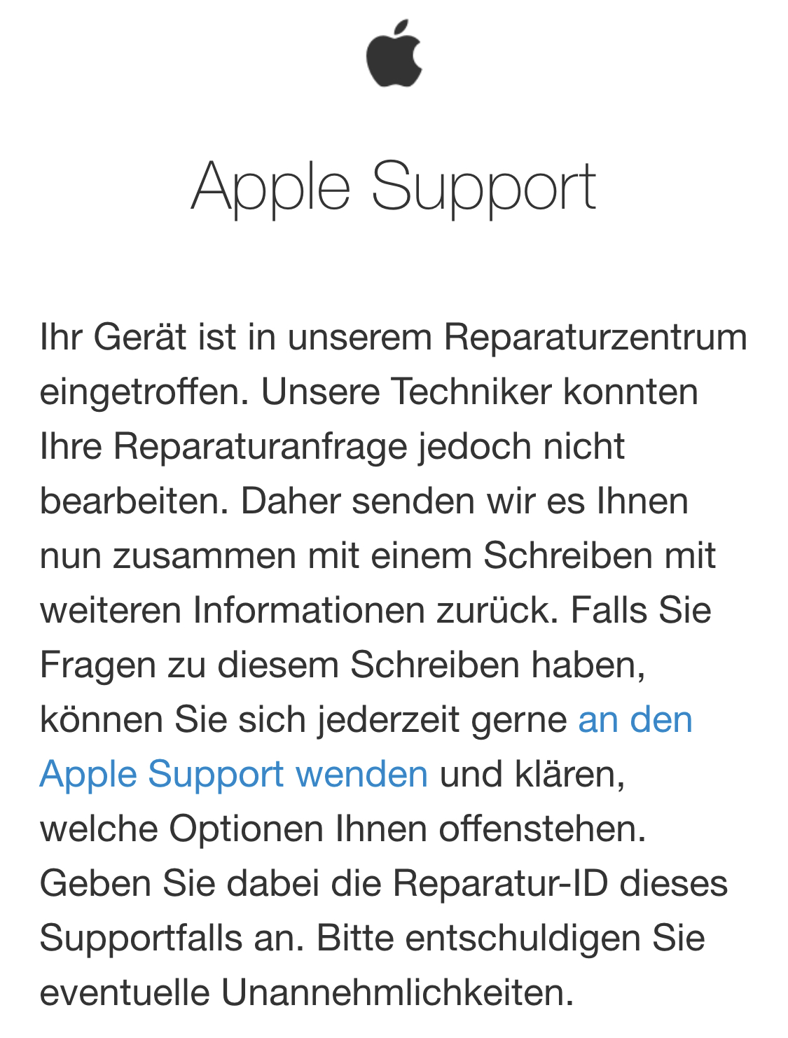 Ihr Gerät ist in unserem Reparaturzentrum eingetroffen. Unsere Techniker konnten Ihre Reparaturanfrage jedoch nicht bearbeiten. Daher senden wir es Ihnen nun zusammen mit einem Schreiben mit weiteren Informationen zurück. Falls Sie Fragen zu diesem Schreiben haben, können Sie sich jederzeit gerne an den Apple-Support wenden