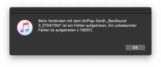 Seit dem Update auf MacOS 10.14 (Mojave) kann ich meinen B&O Beosound 2 Lautsprecher nicht mehr in iTunes verbinden. Wenn ich es versuche, dann dreht der "Kringel" ewig vor sich hin: