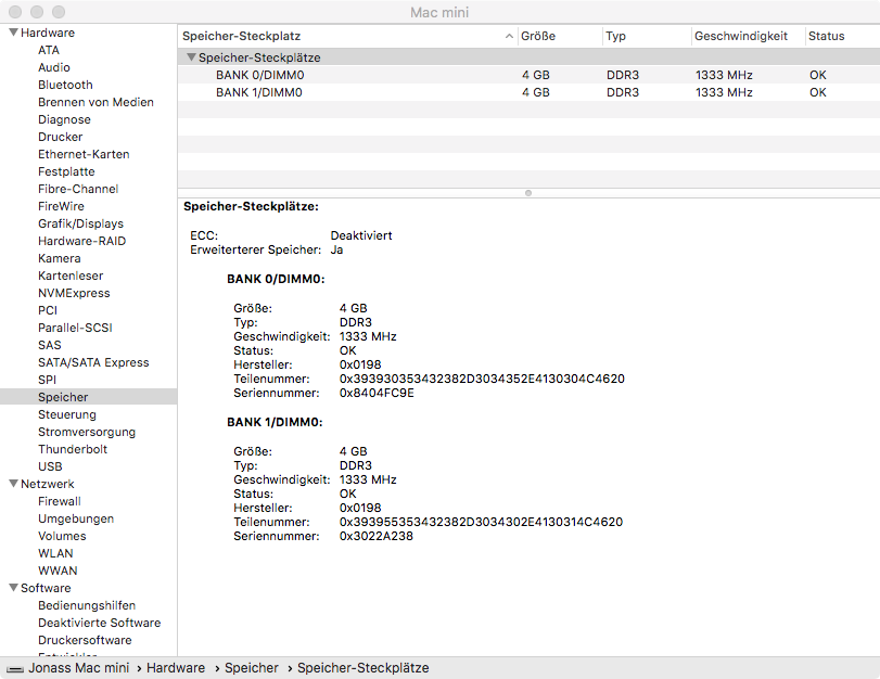 Ich habe bereits eine SSD eingebaut und möchte den RAM nun auch auf 8GB erweitern. Im Mac mini ist bereits ein 4GB RAM Modul vorhanden. Allerdings ist dies ein 1333MHz Modul, was mich etwas verwundert, denn laut der Seite mit den technischen Daten von Apple über den Rechner werden 1066MHz Module benötigt.