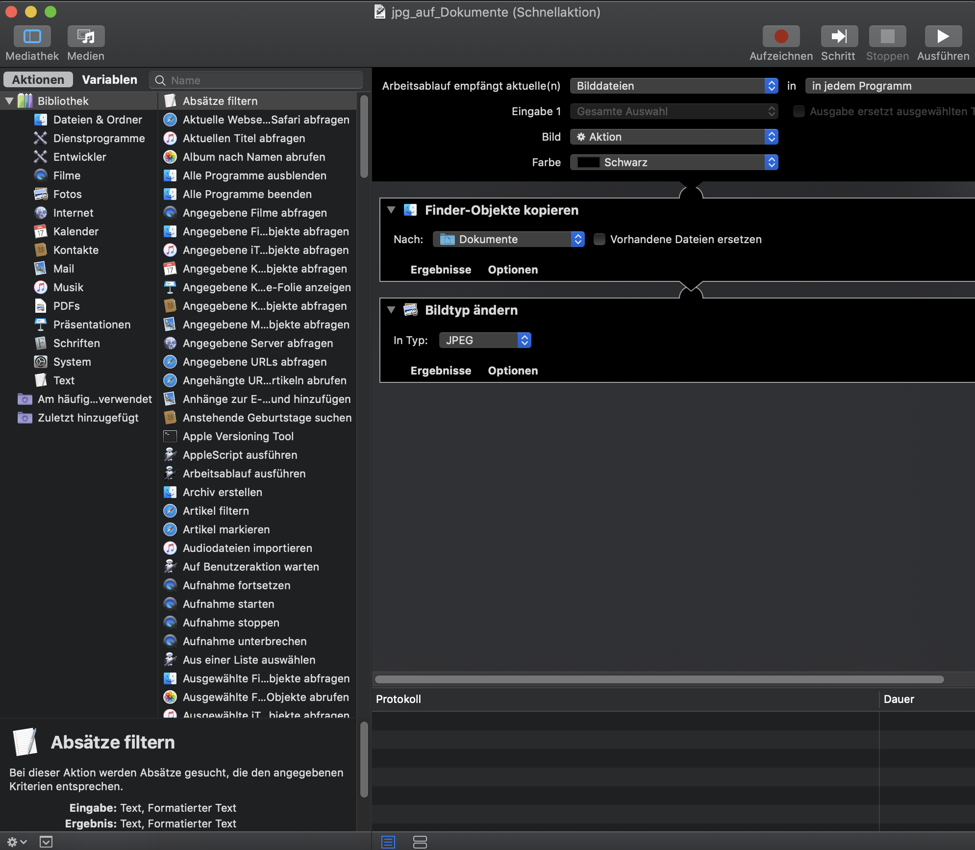 Wenn du den neuen Arbeitsablauf als Schnellaktion angibst, ist er über das Dienste-Menü verfügbar.