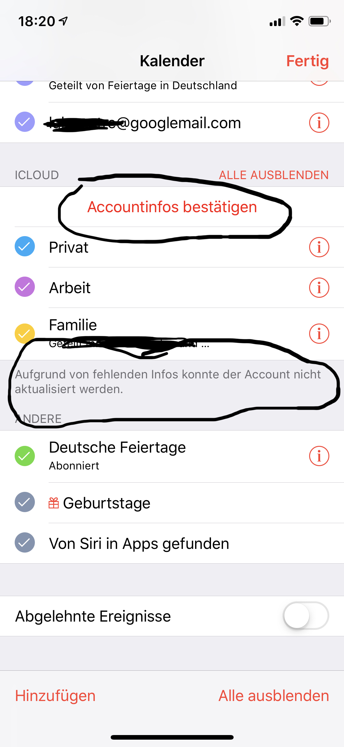 Fehlende Accountinfos zur Aktualisierung des Familienkalenders