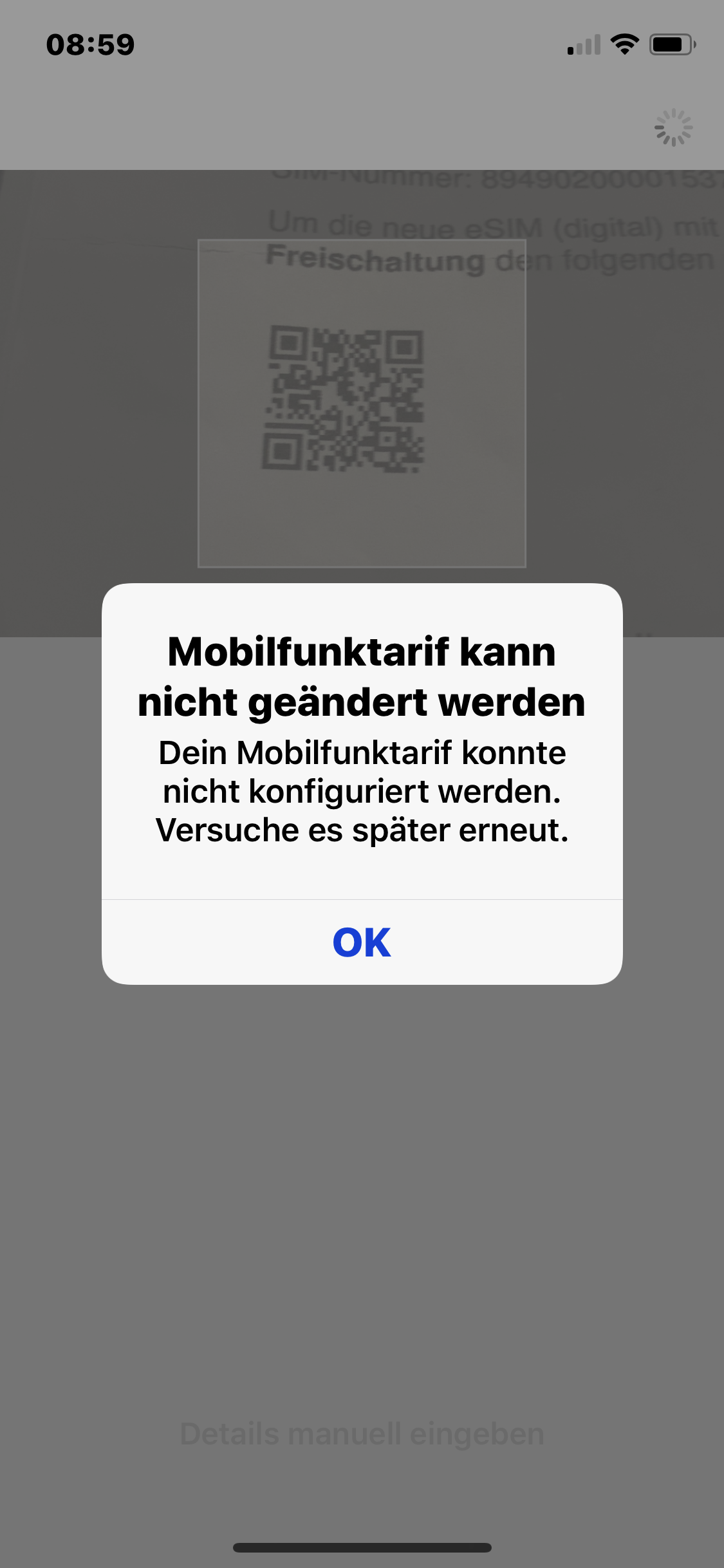 Nach jedem inegrations versuch bekomme ich die Aussage vom Telefon das (Dein Mobilfunktarif konnte nicht konfiguriert werden.Versuch es später erneut) So die Meldung meines Telefons.