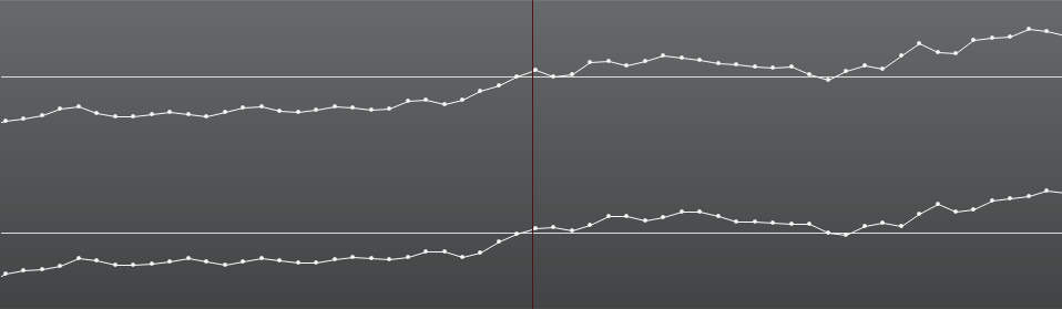 … wo jeder Punkt den du siehst tatsächlich ein Sample ist. Oder anders ausgedrückt, du siehst bei 48KHz Audio mal eben achtundvierzig tausend solcher Punkte pro Sekunde Audio. 😉 Das heißt FCPs Genauigkeit reicht „nur" bis auf jeden 600sten Sample. FCP ist aber auch keine DAW, also ist das mit Sicherheit trotzdem mehr als ausreichend. Ich würde es also so interpretieren, dass Apple damit meint, dass man nicht auf Framegenau beschränkt ist, sondern schon auf eine Sample- oder eben Subframe-genaue Bearbeitung kommt. Tomayto, tomahto. 😉