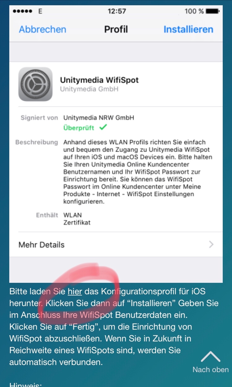 vielen Dank für deine Nachricht.Genauso habe ich auch versucht vor einige Zeit vorzugehen.Diese Informationen habe ich zwar gefunden aber ich konnte die Konfiguration nicht durchführen,weil weder noch mein iPhone noch iPad darauf reagiert haben.Mit unytimedia habe ich zweimal telefoniert.Bei erste Anruf haben Sie mir gesagt das sie nicht helfen können und ich mich bei Apple informieren soll.Das habe ich nicht getan, weil ich wusste das nicht mit Apple zu klären ist sondern, Unitymedia das lösen muss.Bei zweite Anruf haben Sie mir gesagt das wahrscheinlich damit zutun hat dass ich keine Hotspot in der Nähe haben muss 😁Daraufhin habe ich hier in die Community geschrieben.Da ich in zwischen viel zutun hatte, konnte ich mich nicht bis heute drum kümmern.