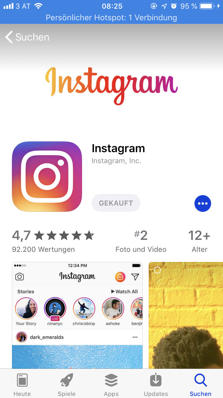 Hallo! Vor einigen Tagen wollte ich wie gewohnt instagram öffnen, die app war aber nicht mehr auf meinem Iphone. Im app Store ladet sie immer kurz & dann hört es auf, hab vieles schon probiert: im App store abmelden, Handy neustarten & nichts hilft, jetzt habe ich die App aus meiner ID gelöscht & wenn ich sie runterlade steht „gekauft“ dort, auf meinem Handy erscheint die App aber nicht
