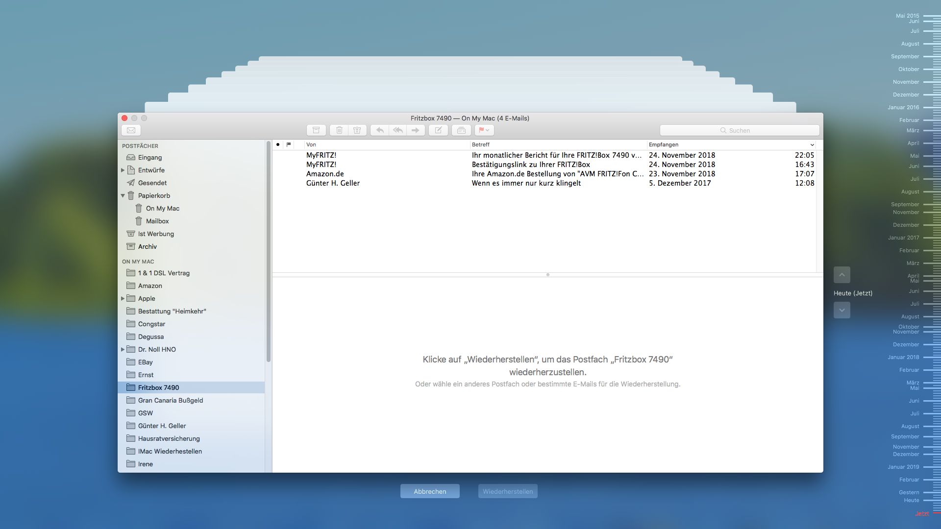 Ich habe einen IMac und seit 2015 eine 1000GB Festplatte Intenso an die Time Machine angeschlossen. Jetzt nach fast 4 Jahren wollte ich eine Wiederherstellung von E-Mail Postfächern machen, die abhanden gekommen sind. Leider lässt sich der Wiederherstellungs -
