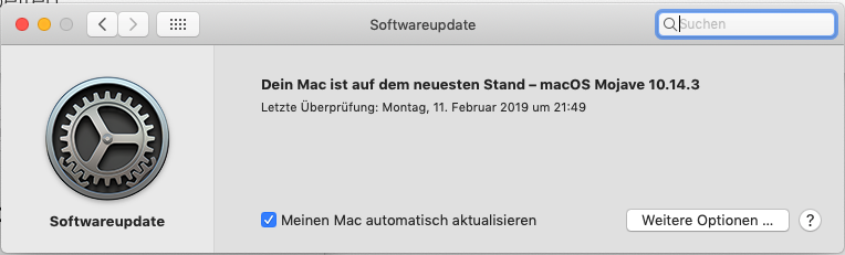 Danke für die Rückmeldung. Mac OS Mojave ist auf dem aktuellsten Stand (siehe Anhang). Auch im App Store wird kein Update angezeigt. Daran kann es also eigentlich nicht liegen.