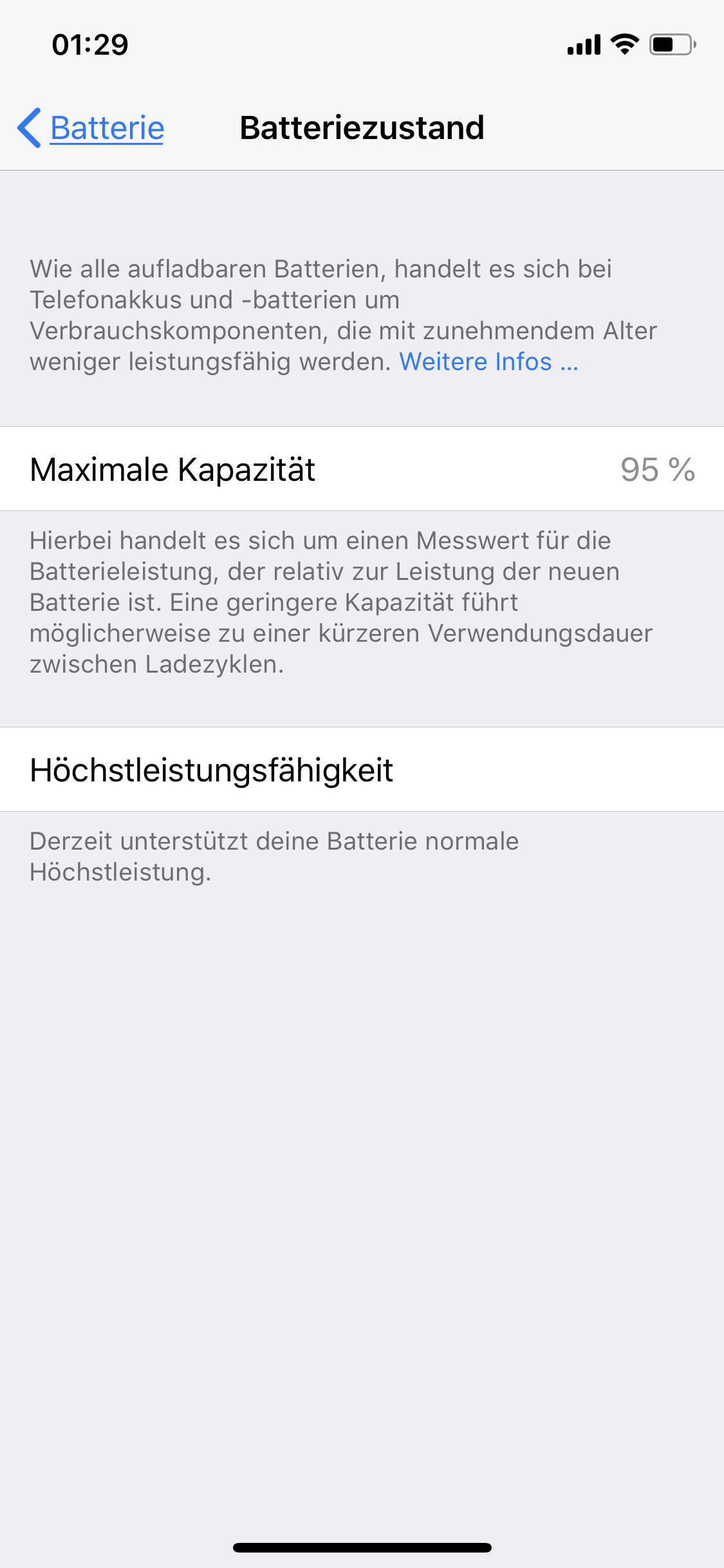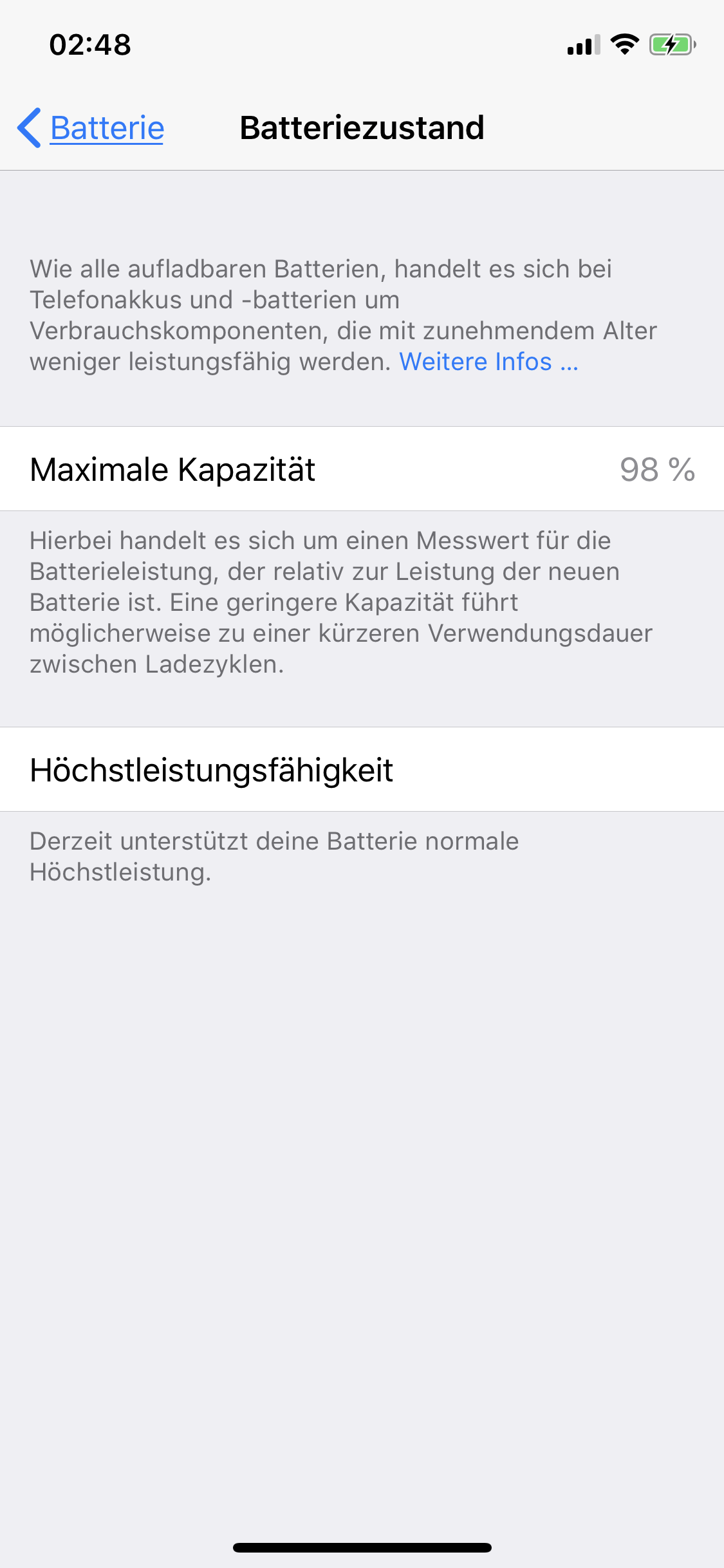 Mein iPhone XS 256GB hat anscheinend Probleme einen plausiblen Wert für den Batteriezustand anzugeben. Erworben wurde das Gerät im Oktober 2018, seit allerspätestens November 2018 wird bereits ein Batteriezustand von 95% angezeigt und das bis heute. Ich bin der Sache nun endlich mal auf den Grund gegangen und durfte über eine Software eines Drittanbieters feststellen, dass die Kapazität (laut ebendieser Software) noch etwas mehr als 99% entspricht.
