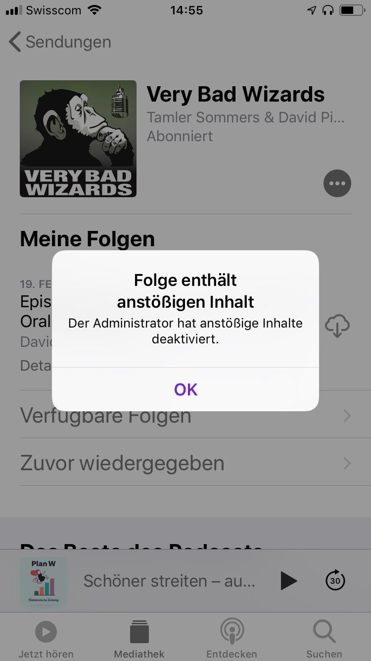 Ich möchte unbedingt die neuste Folge meines Lieblingspodcasts "Very Bad Wizards" hören - doch plötzlich hat der Administrator den Download verhindert. Es erscheint die Meldung "Folge enthält anstössigen Inhalt - Der Administator hat anstössige Inhalte deaktiviert". Die Sprache der beiden Uniprofessoren Tamler Sommers & David Pizarro ist jetzt vielleicht nicht immer ganz so gepflegt, aber durchaus zumutbar.