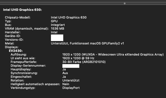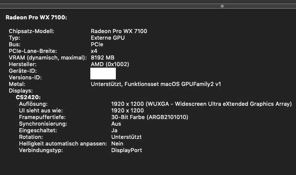 Der Monitor ist von Eizo CS2420 - nachweislich auch 10bit Farbtiefen-fähig. Unter Info Vorschau natürlich auch eGPU bevorzugen gewählt :