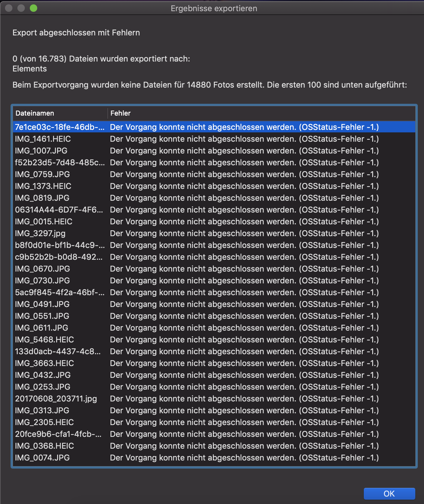 Diese Fehlermeldung - das hatte ich auch mal aber ich weiß nicht mehr was ich damals gemacht habe... Versuche mal diese Häppchenweise zuerst auf deine Mac Festplatte zu exportieren und danach auf die Externe zu verschieben.
