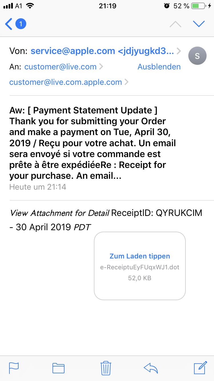 Hallo, mit dem Öffnen des Mail-Anhangs sollst Du wahrscheinlich auf eine Fake-Seite geleitet werden und dazu verleitet werden, bestimmte Daten preiszugeben. Am besten nicht öffnen und die Mail, wie im u. a. Artikel beschrieben, an Apple weiterzuleiten.