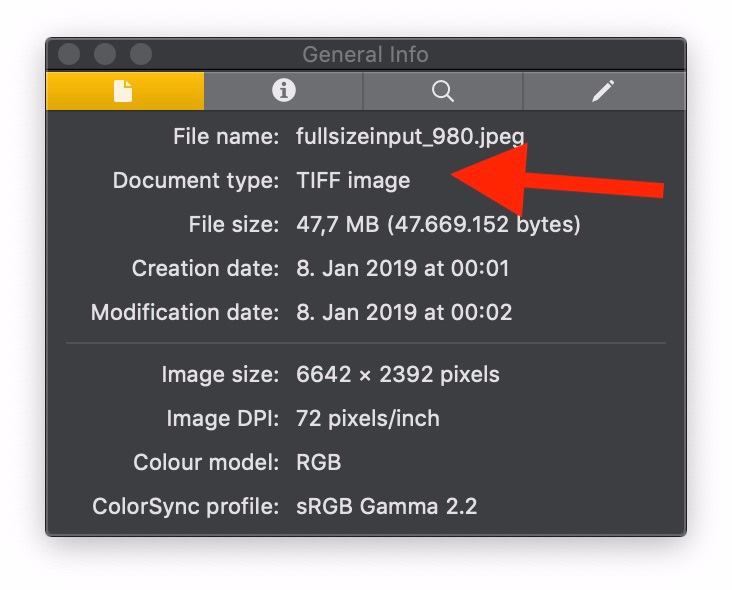 Ich war ziemlich überrascht, als ich diese zusätzlichen Bilder einmal in der Vorschau geöffnet habe. Die Dateigrösse ist gigantisch. Die bearbeiteten Versionen sind mehr als zehnmal so gross, wie die ursprünglichen jpg. Wenn ich ein mit dem iPhone aufgenommenes JPG von 3MB mit Luminar bearbeite, habe ich hinterher eine bearbeitete Datei von 30MB bis 70MB, jenachdem, wie detailliert das Bild ist. Die Vorschau (Im Inspektor) zeigt mir , dass die von Luminar erzeugten Dateien zwar .JPEG als Dateiweiterung haben, aber eigentlich verkleidete TIFF Dateien sind.