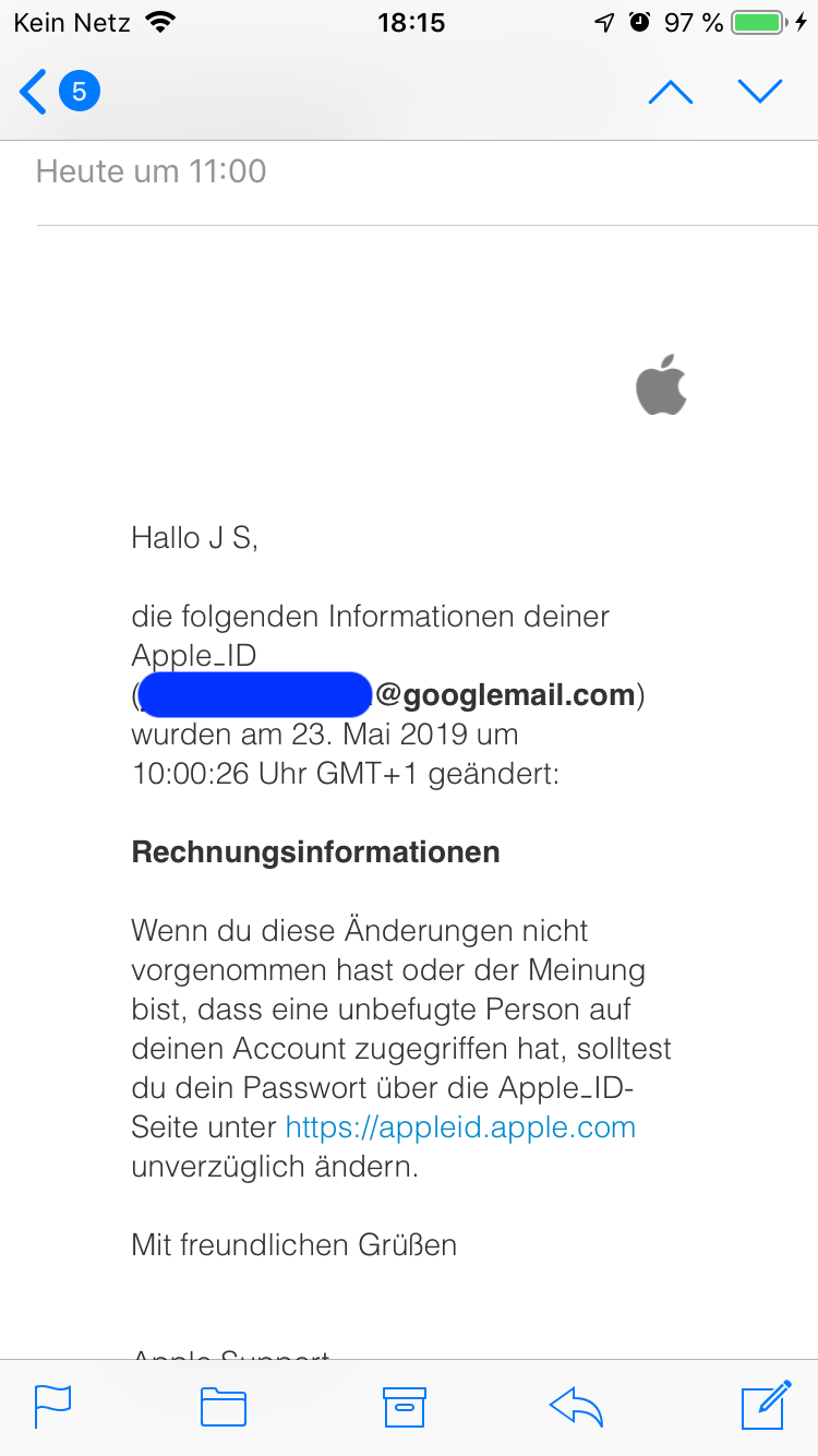 ich habe ein Fremdzugriff auf meine Apple ID, da ich heute morgen eine komische E-Mail bekam, dass um 10:00 auf meine ID zugegriffen wurde und die Zahlungsart geändert wurde !! Anbei ein Bild siehe unten