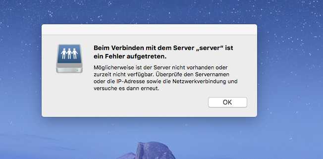 Wenn der mac im Netzwerk ist, dann liegt das Problem bei dem Server. Der Admin des Servers sollte mal prüfen, ob der Server noch im Netz ist.