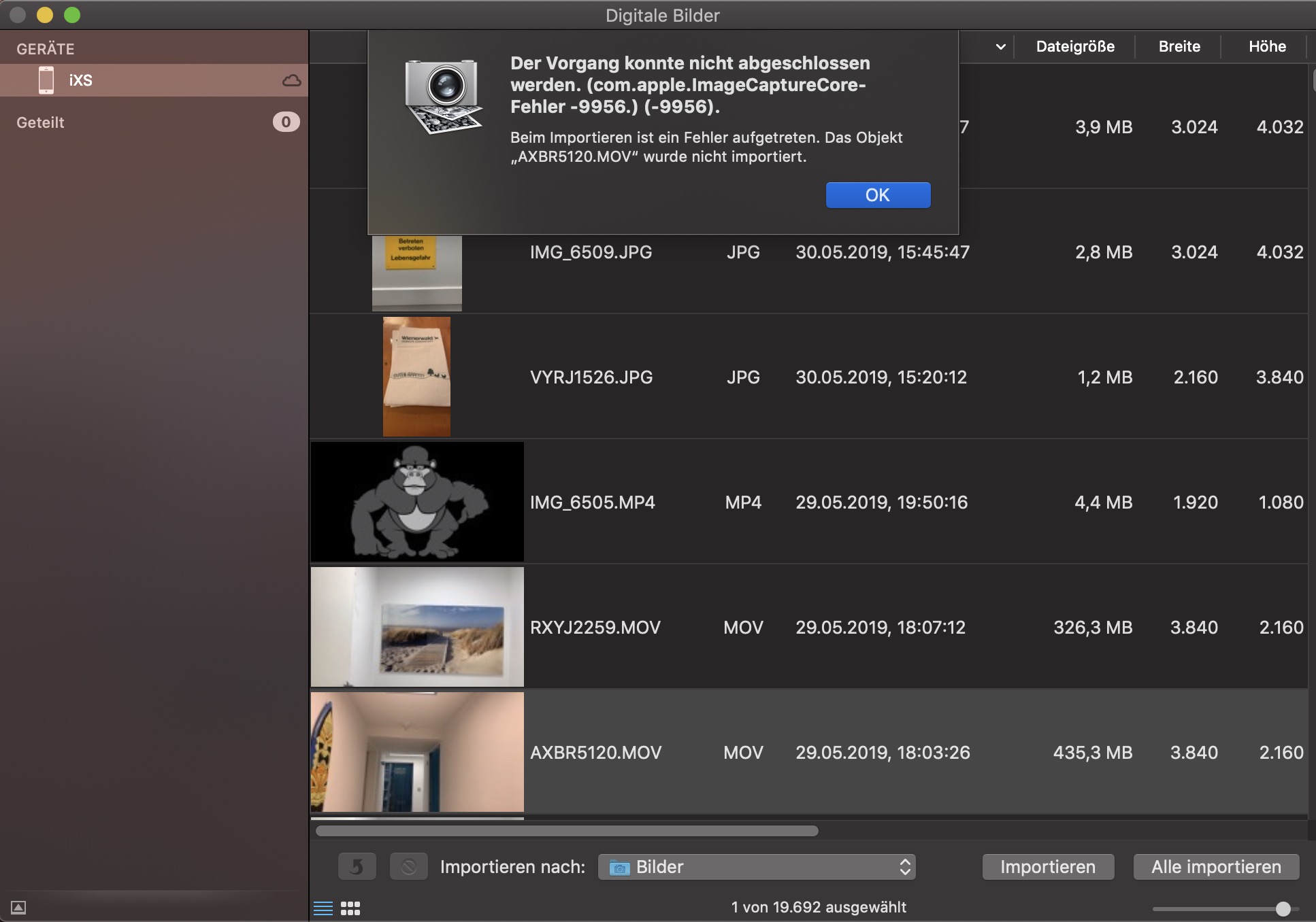 Fehler erscheint am Mac bei dem Versuch die Bilder vom iPhone via "Digitale Bilder" App zu kopieren. Vorgehehnsweise: iPhone per Original USB-C -> Thunterbold Kabel an den Mac angeschlossen