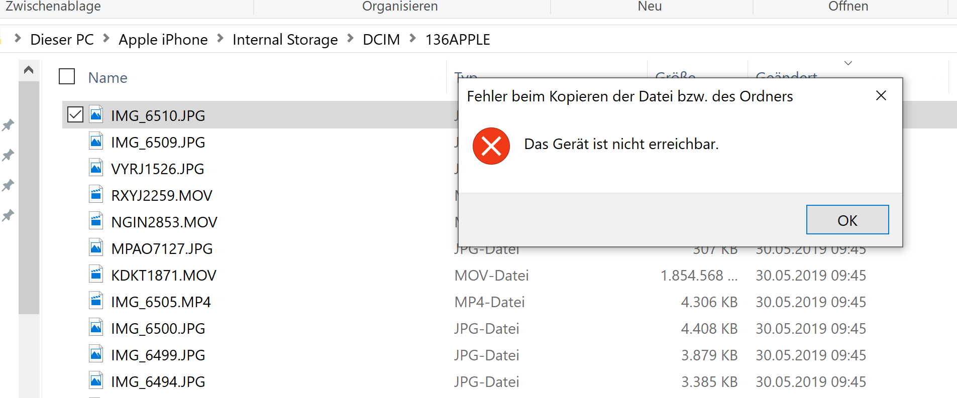 Ich erhalte Fehler beim Kopieren der Fotos aus dem iPhone: Der Vorgang konnte nicht abgeschlossen werden. (com.apple.ImageCaptureCore-Fehler -9956.) (-9956).